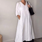 Say goodbye to dresses that cling uncomfortably or reveal unwanted lines. The Winnie V-Neck Dress is designed for effortless elegance, offering a flattering silhouette and all-day comfort without compromising on style. With a chic V-neckline and a breezy A-line fit, this dress moves with you, making it the perfect choice for any occasion. Whether dressing up or down, you'll always feel confident and comfortable!