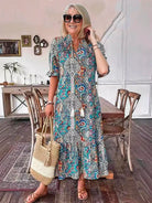 Eye-Catching, Artistic Print: Adorned with a unique vintage pattern, this dress features warm, earthy tones and intricate designs that add artistic flair to your wardrobe.