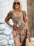 The Leopard Print V-Neck Dress is designed for bold, confident women who want to turn heads effortlessly. With a flattering V-neckline, eye-catching leopard print, and a relaxed yet shapely fit, this dress strikes the perfect balance between chic and comfortable. Whether you’re heading to brunch, a night out, or a stylish getaway, this statement piece ensures you stand out with fierce elegance.