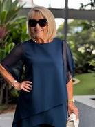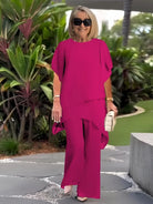 Flattering Fit: The draped, double-layered top and tailored pants beautifully enhance your natural figure, offering a flattering silhouette.